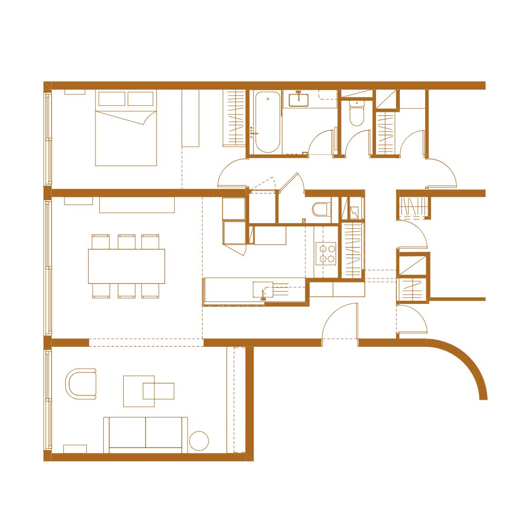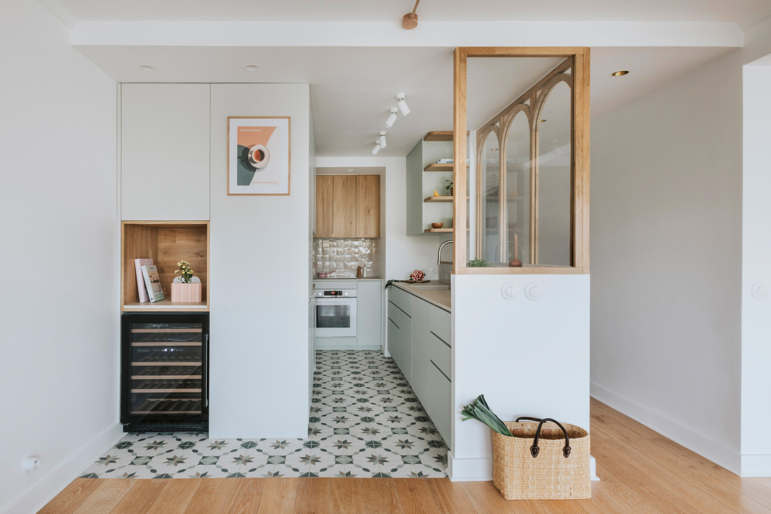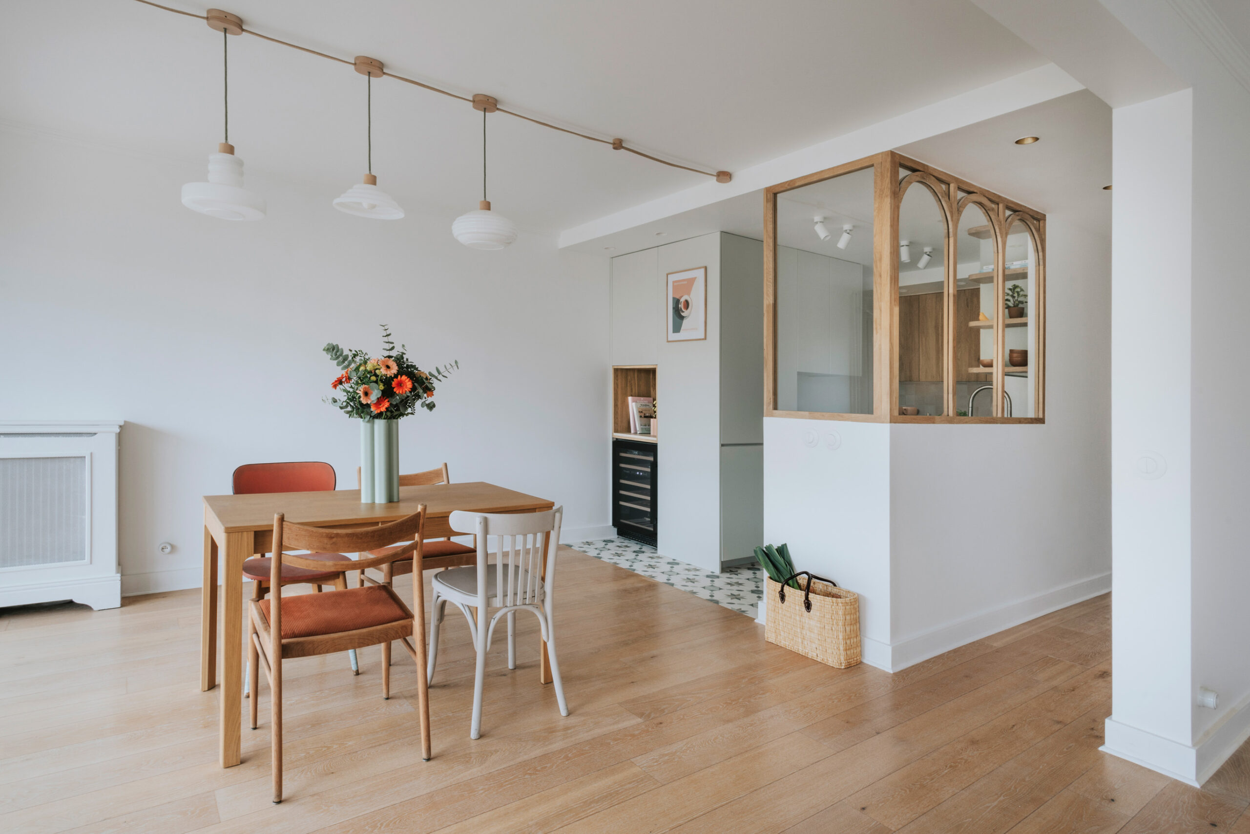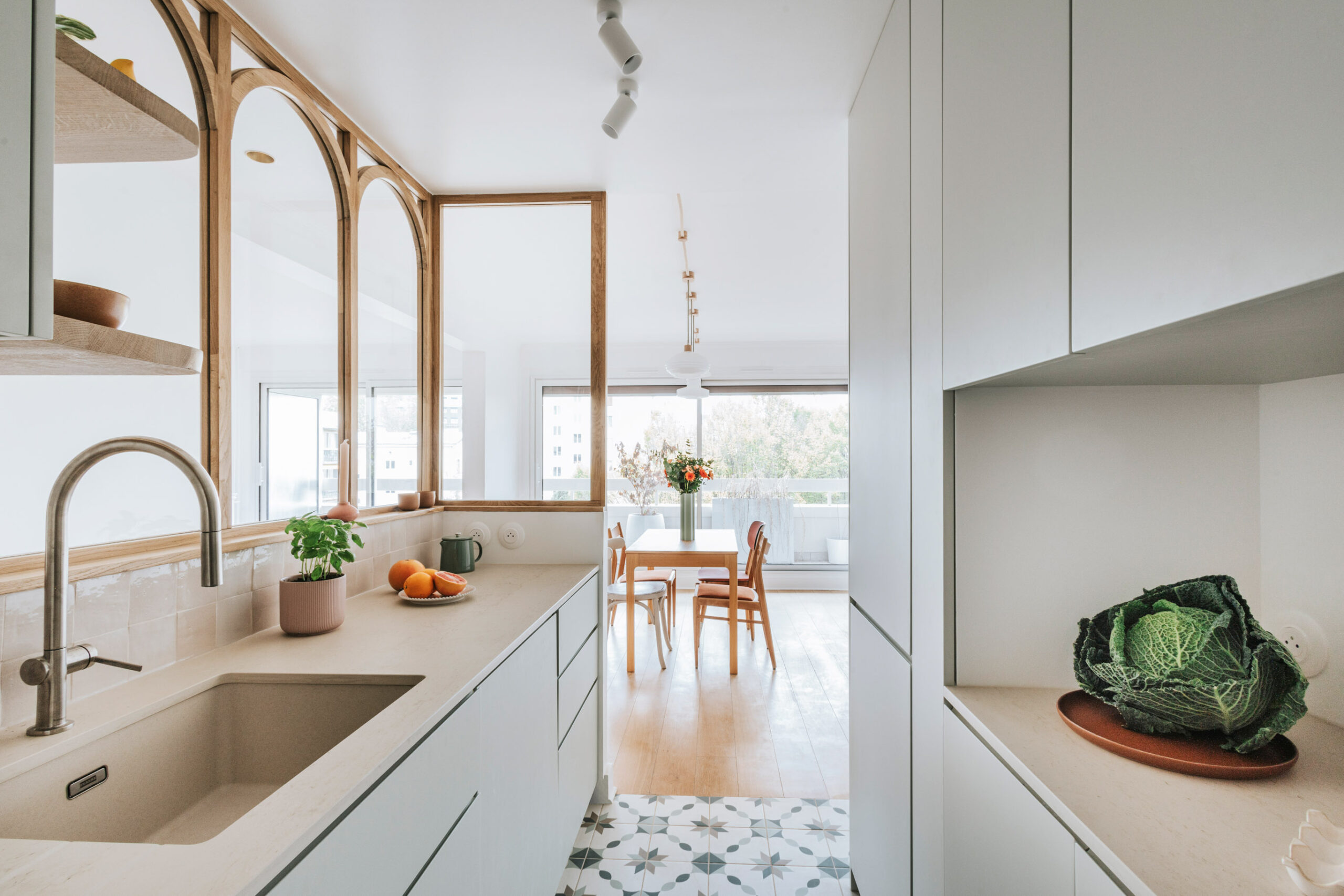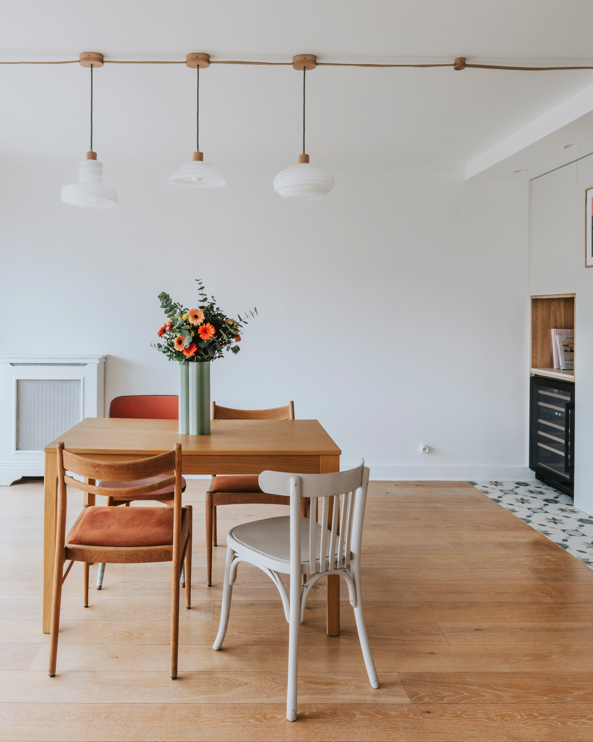 L’enjeu de ce projet était de redistribuer complètement cet appartement de 106m2, en replaçant au cœur du logement une belle cuisine ouverte sur le séjour, et en recréant un espace d’entrée accueillant et optimisé. Les anciens couloirs intègrent désormais de nombreux placards, ainsi qu’un nouveau WC et conduisent à une salle de bain entièrement refaite dans un esprit rétro moderne.
