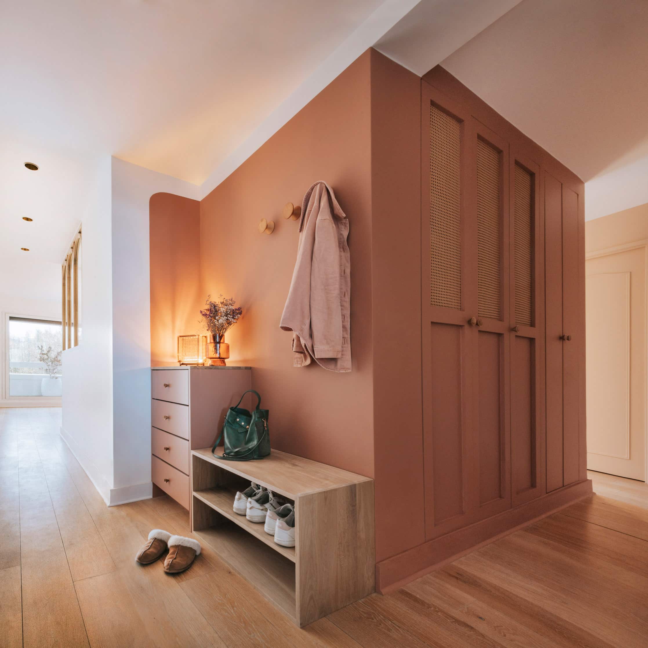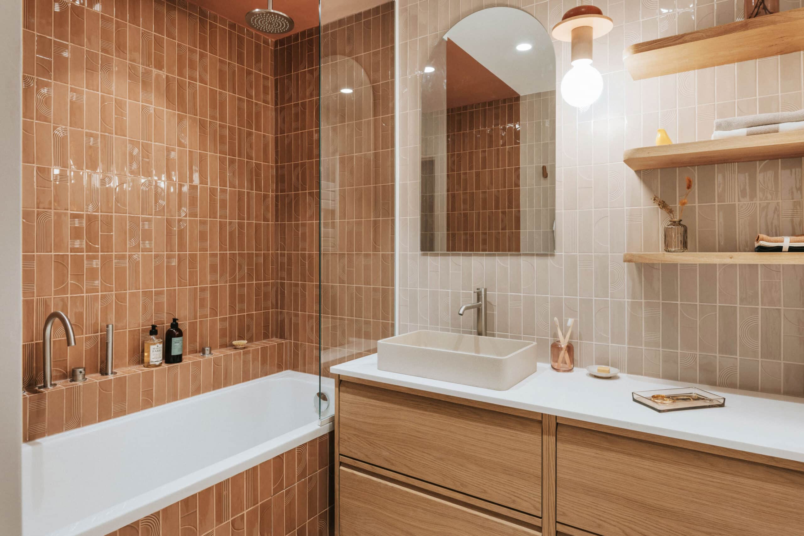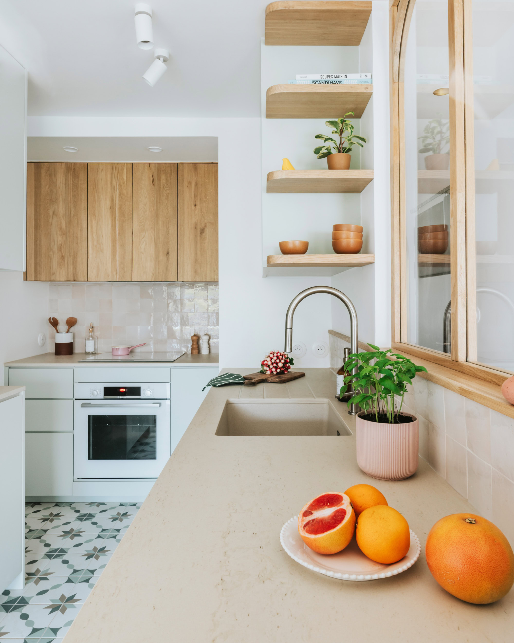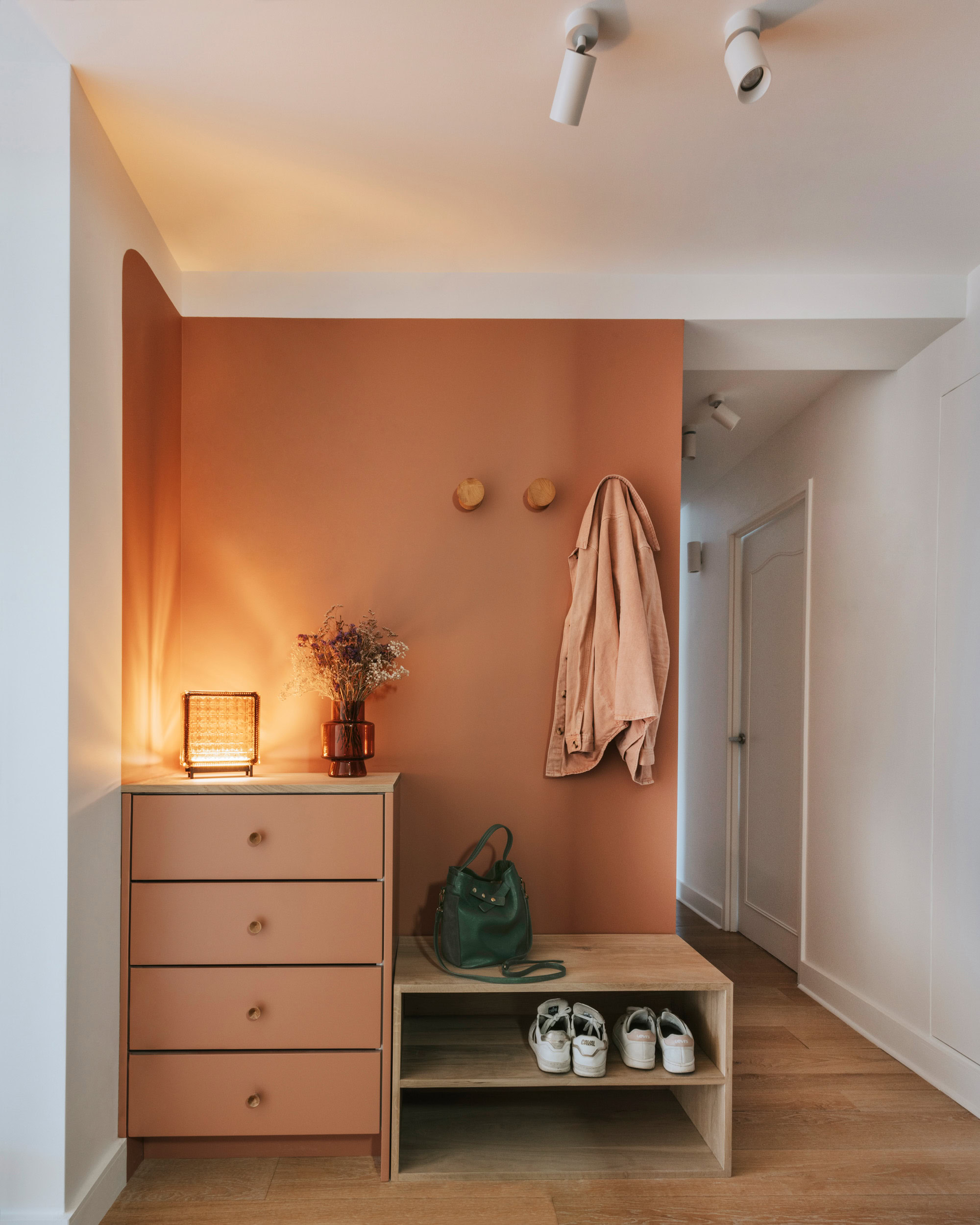 Des couleurs à la fois douces et vitaminées, avec la cuisine qui dévoile des nuances de verts qui contrastent avec des éléments dans les tons rose orangé. Une jolie association qui permet d’introduire l’utilisation de la teinte terracotta qui habille l’entrée et la salle de bain.