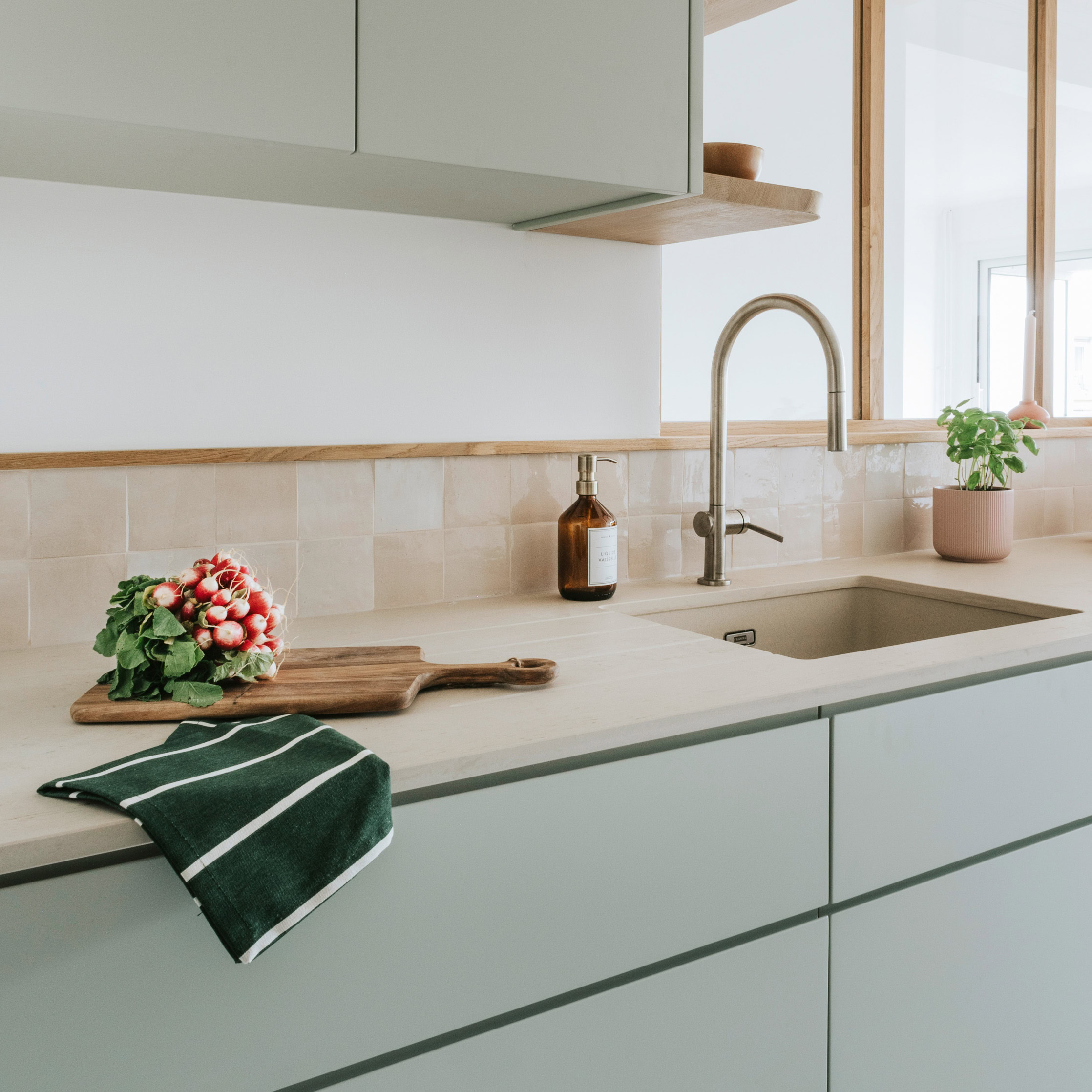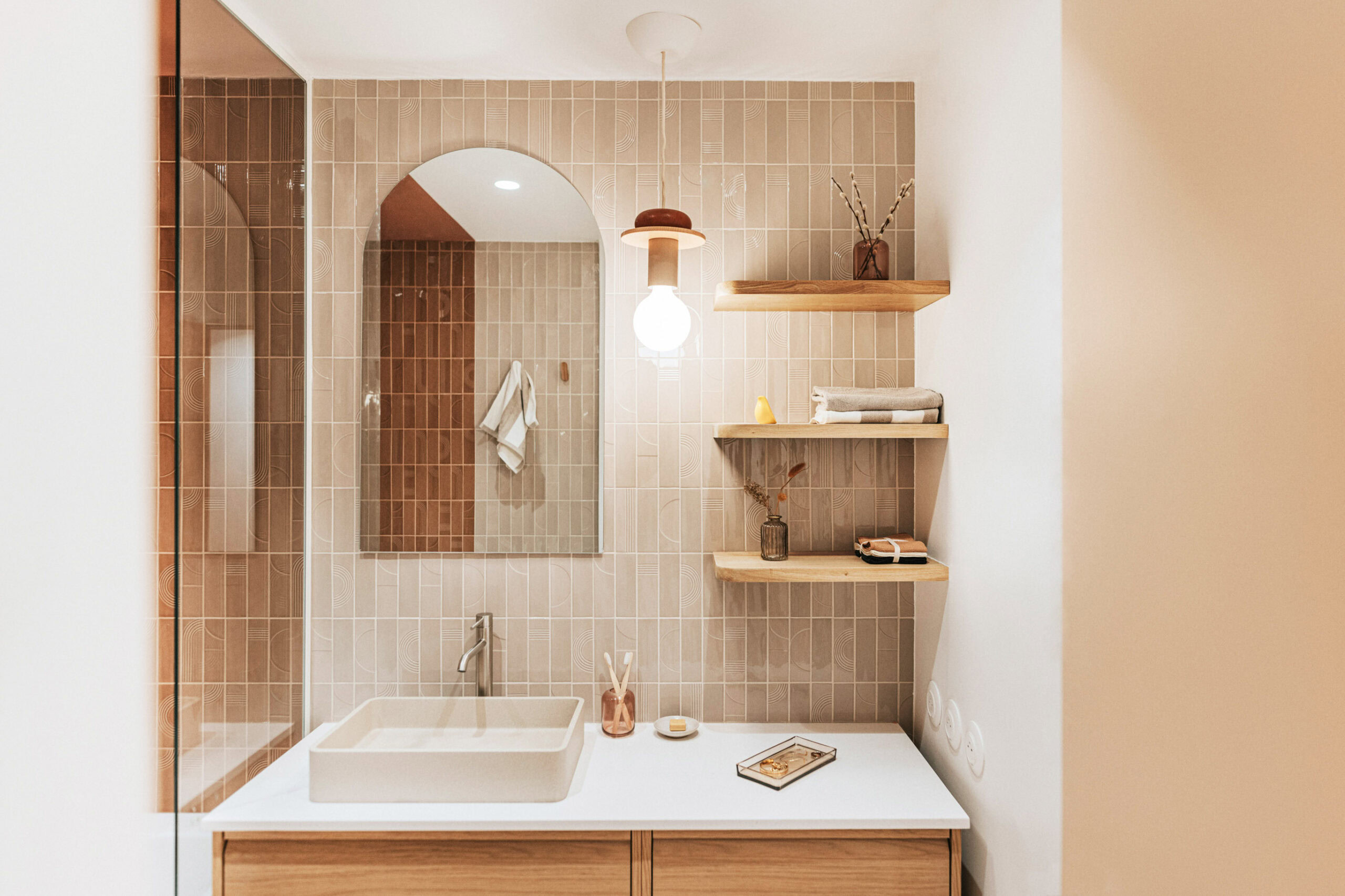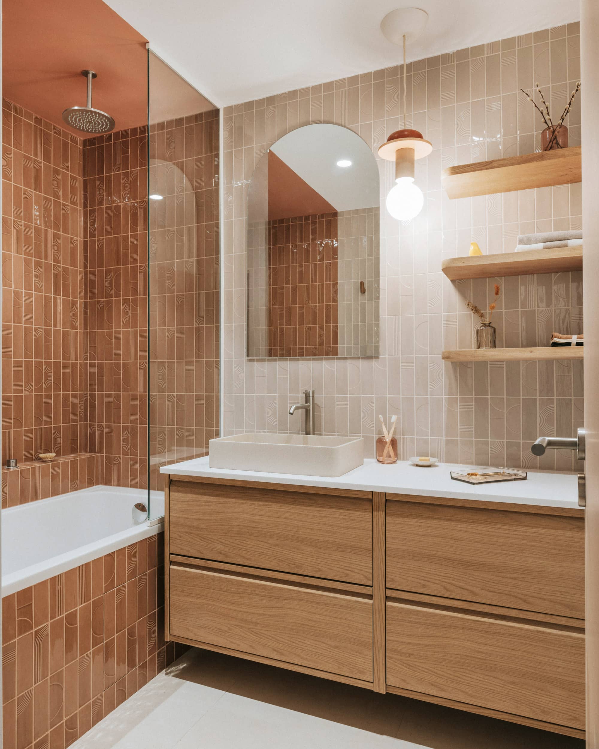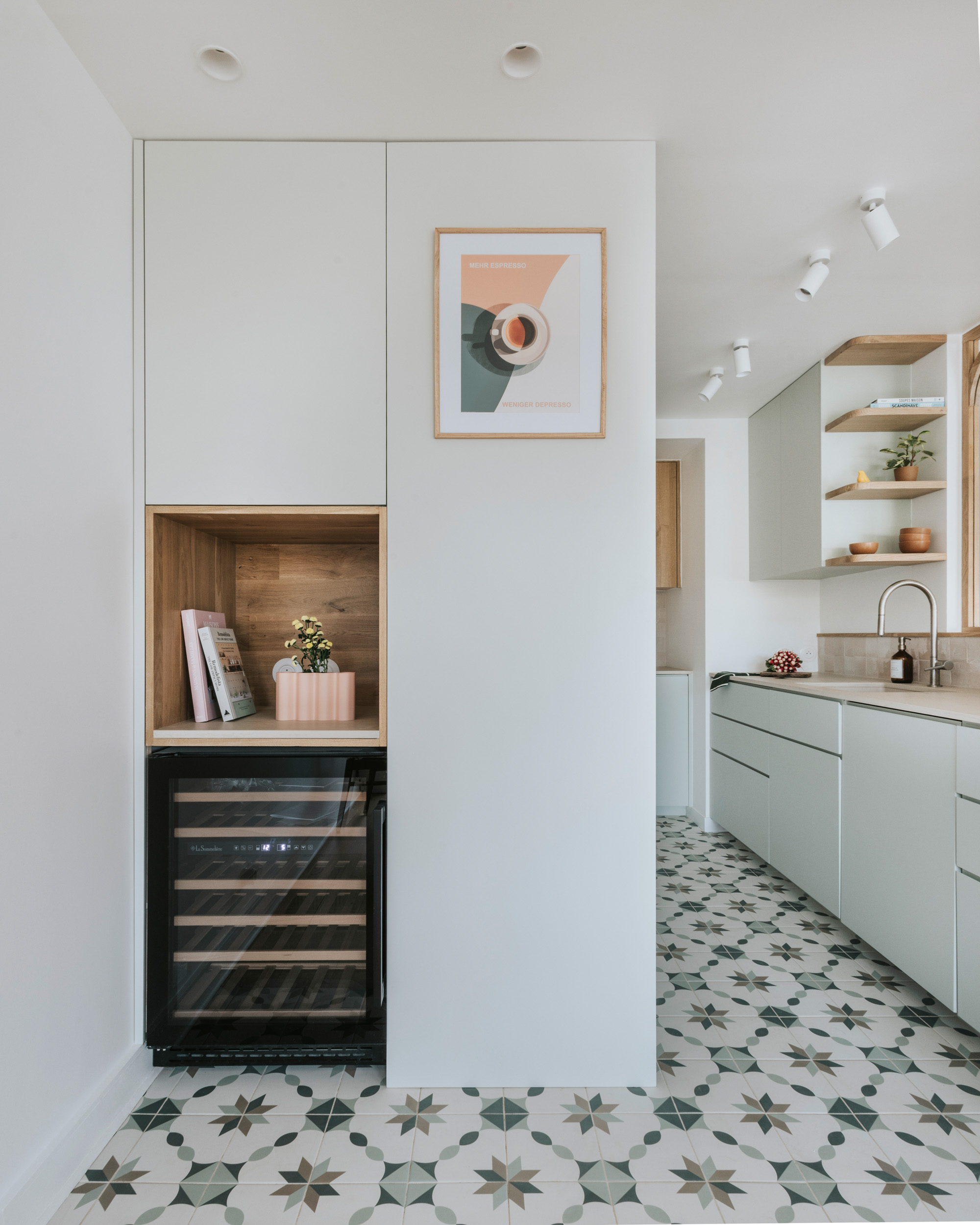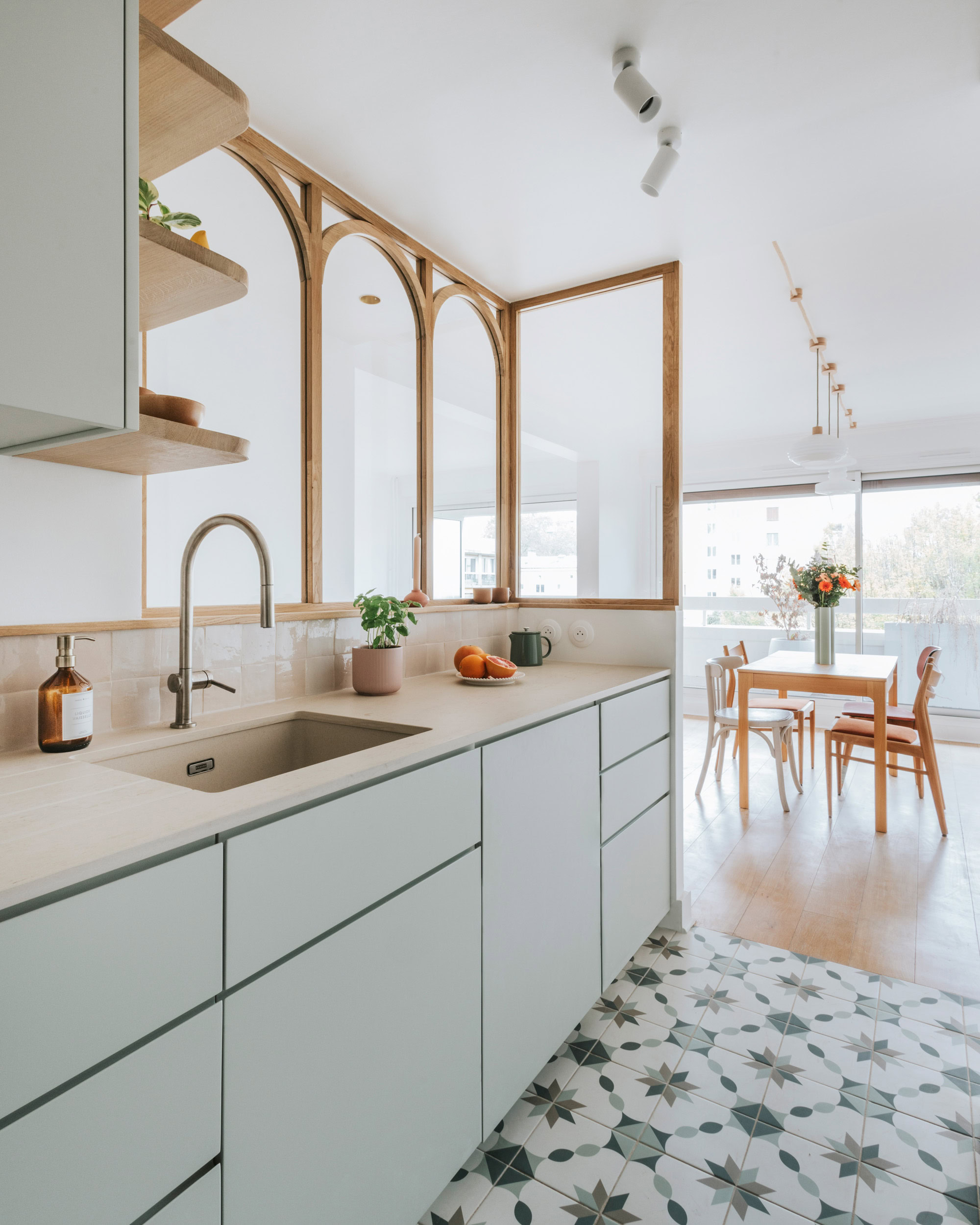Des couleurs à la fois douces et vitaminées, avec la cuisine qui dévoile des nuances de verts qui contrastent avec des éléments dans les tons rose orangé. Une jolie association qui permet d’introduire l’utilisation de la teinte terracotta qui habille l’entrée et la salle de bain.