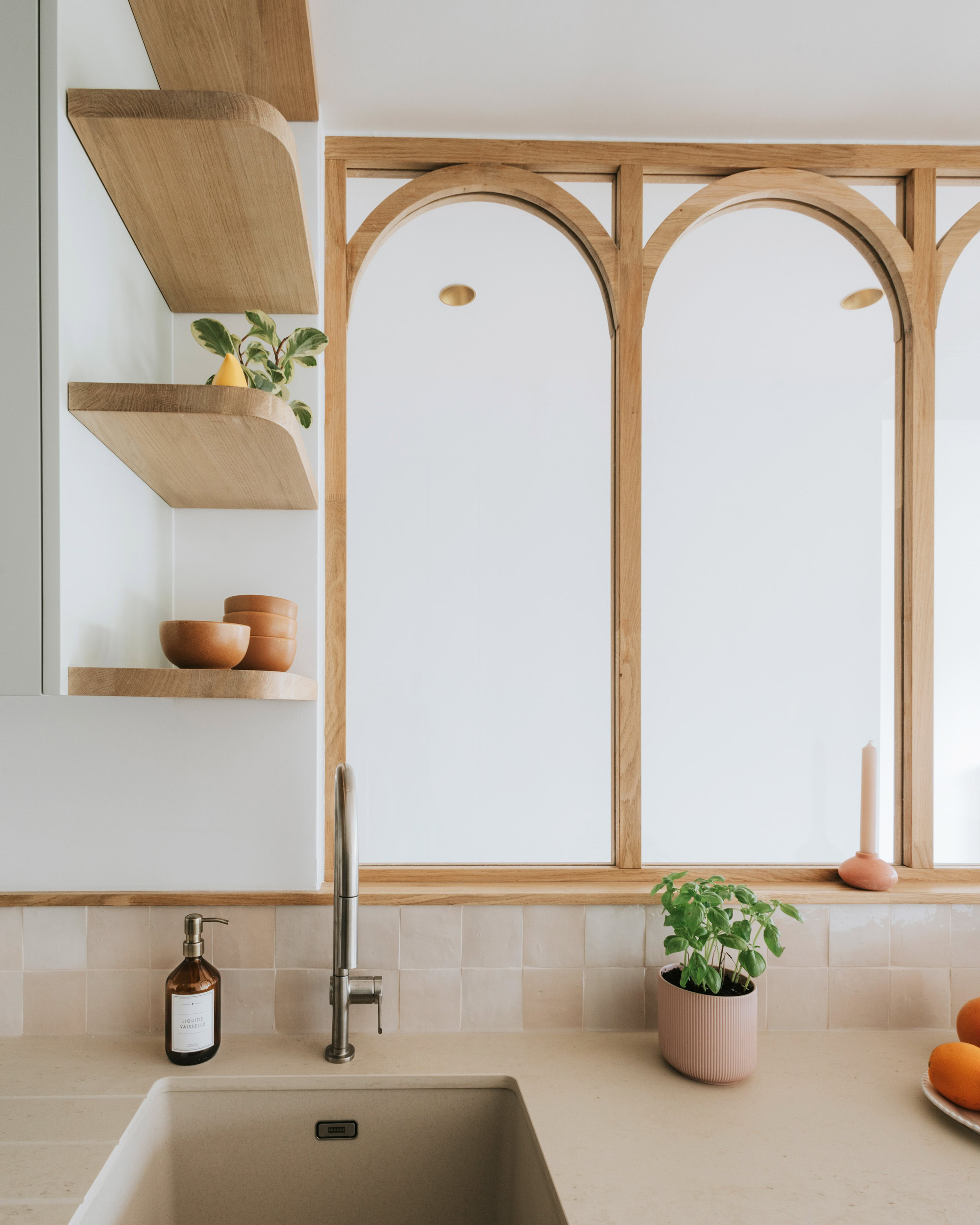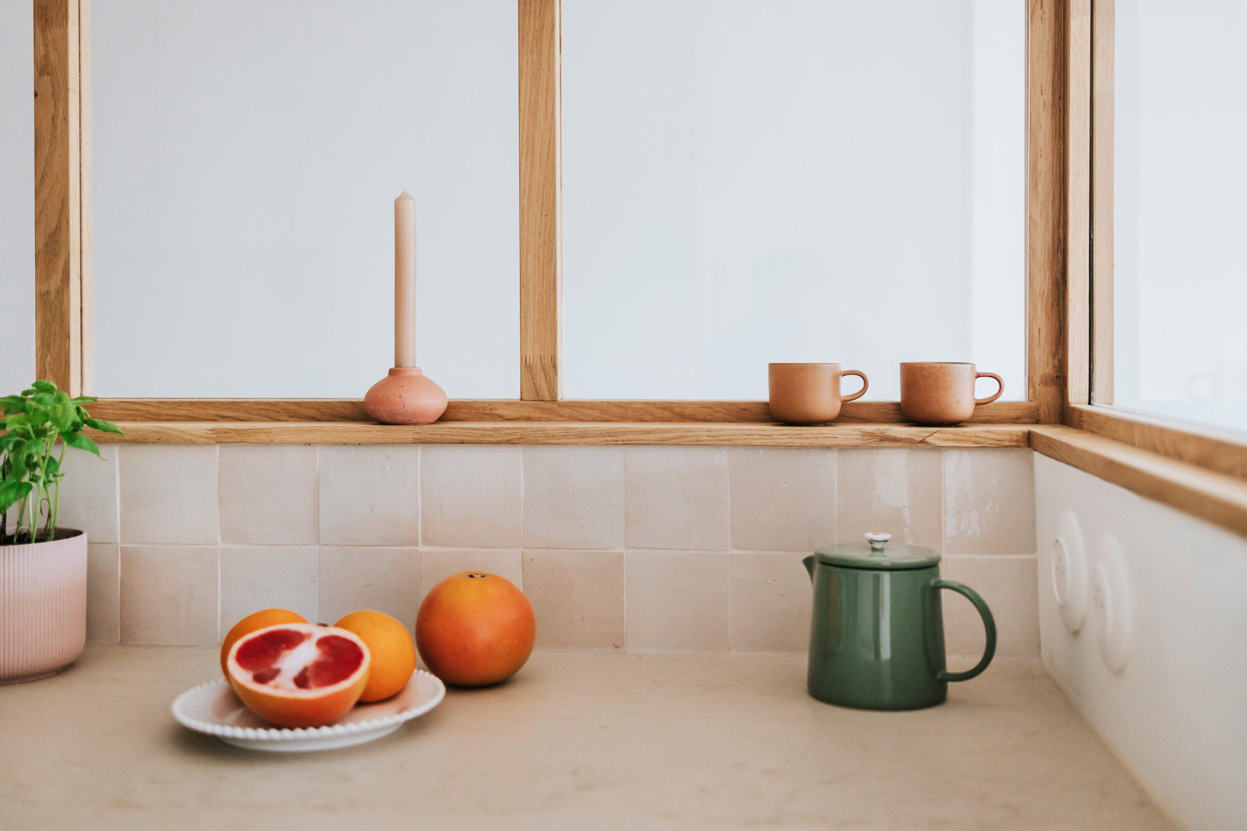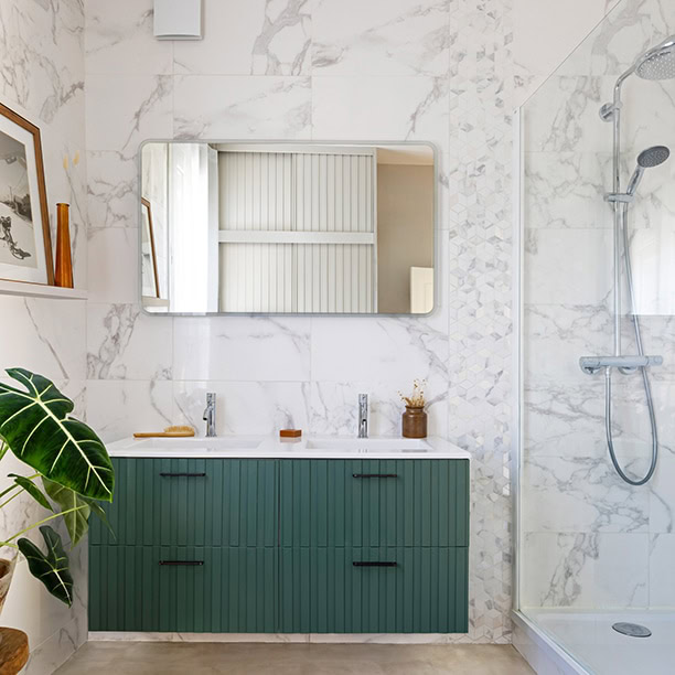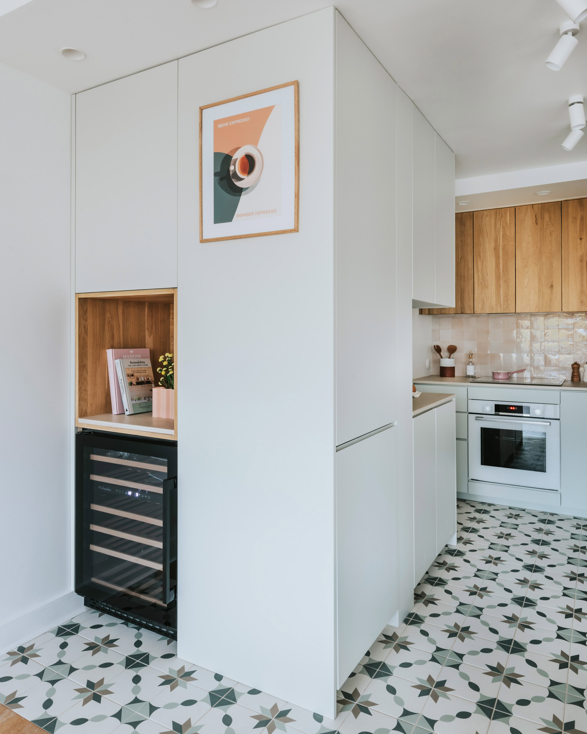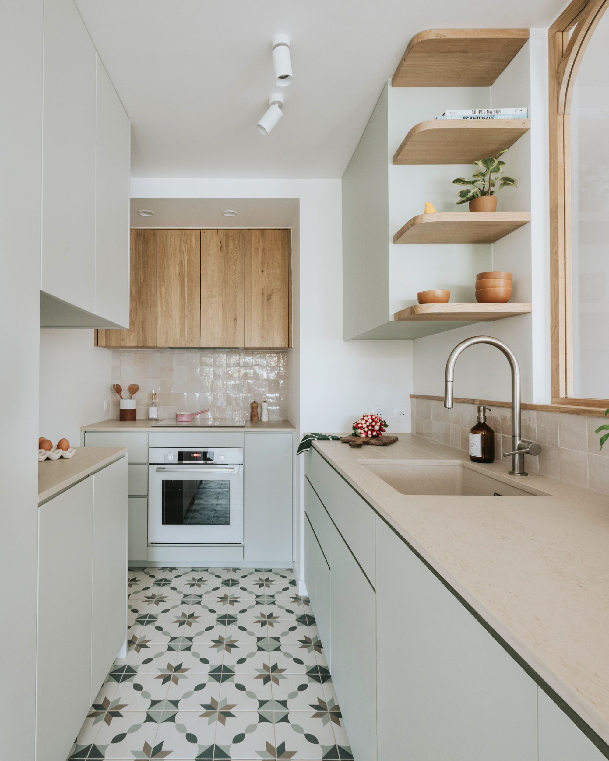 Des couleurs à la fois douces et vitaminées, avec la cuisine qui dévoile des nuances de verts qui contrastent avec des éléments dans les tons rose orangé. Une jolie association qui permet d’introduire l’utilisation de la teinte terracotta qui habille l’entrée et la salle de bain.