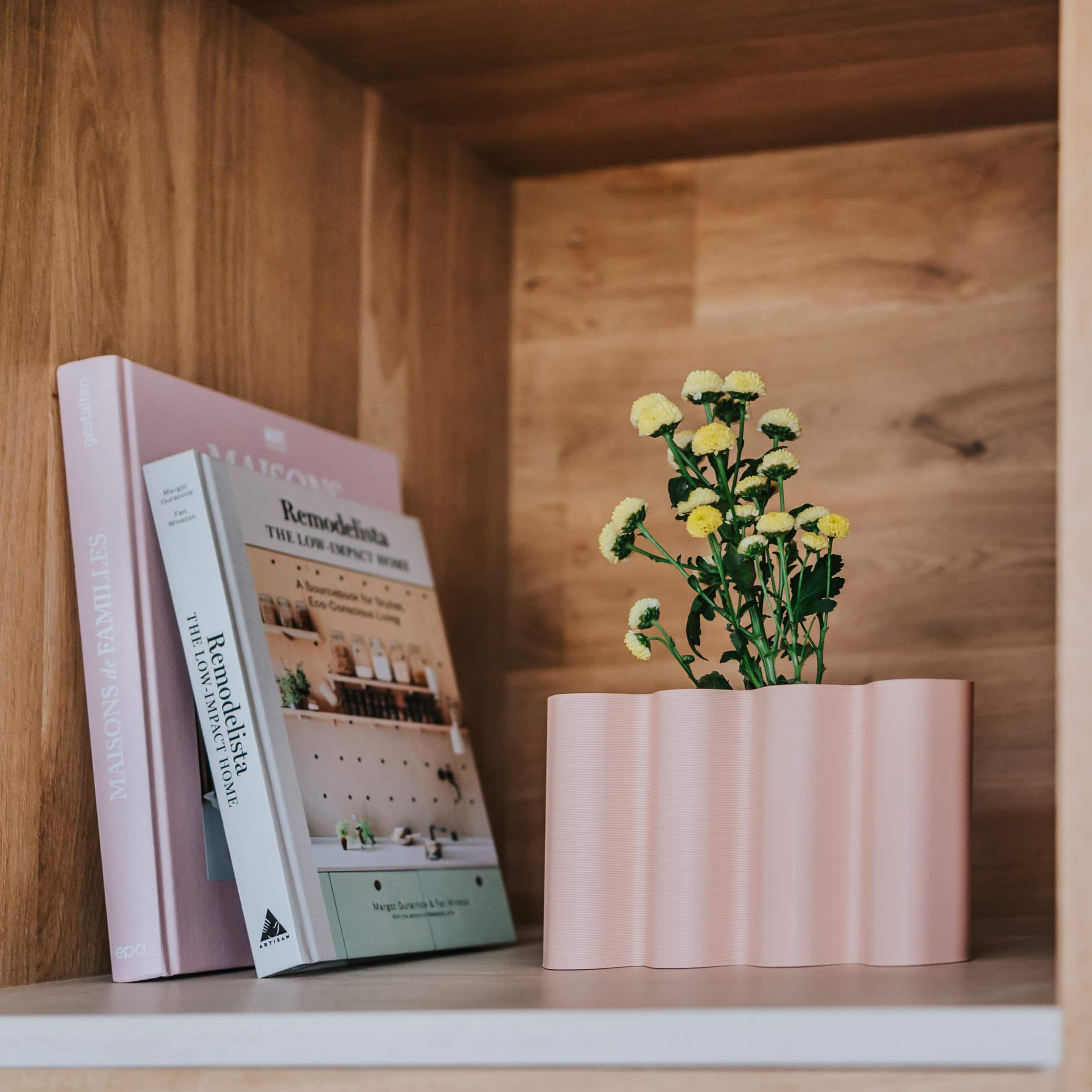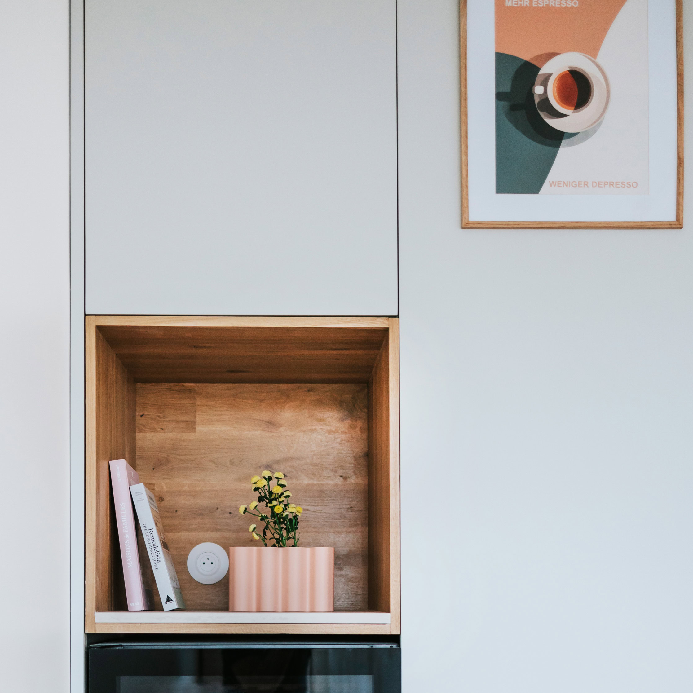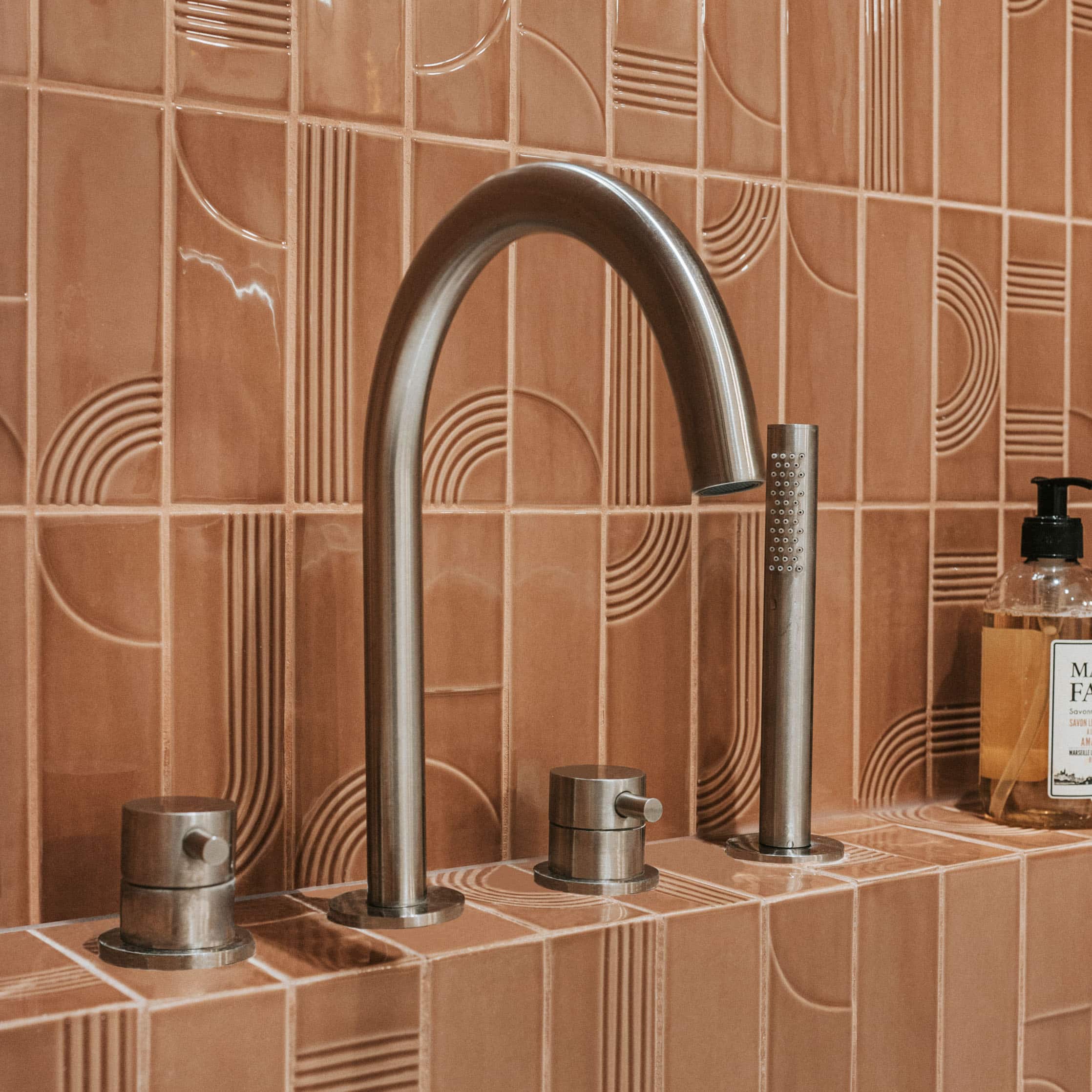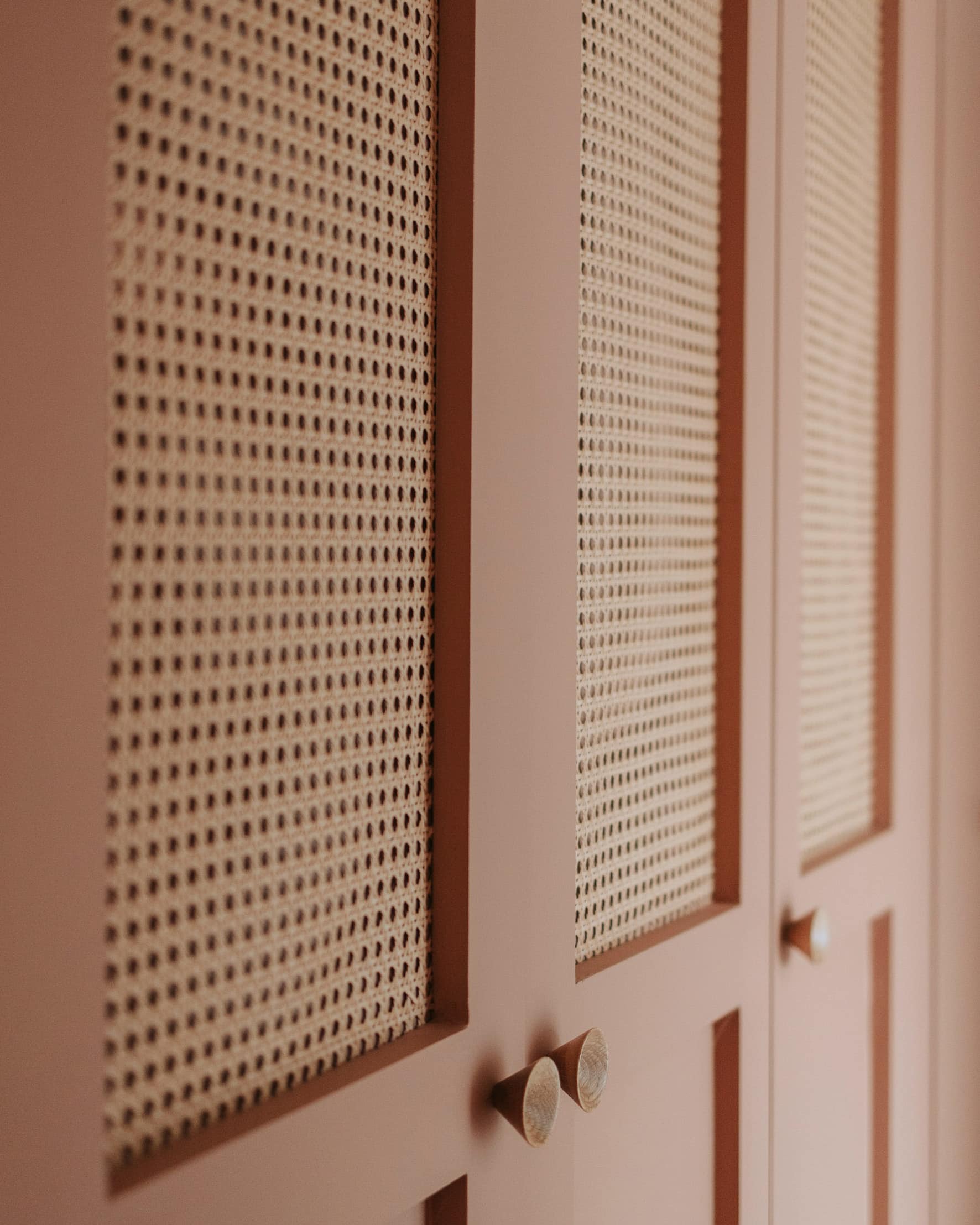 Des couleurs à la fois douces et vitaminées, avec la cuisine qui dévoile des nuances de verts qui contrastent avec des éléments dans les tons rose orangé. Une jolie association qui permet d’introduire l’utilisation de la teinte terracotta qui habille l’entrée et la salle de bain.